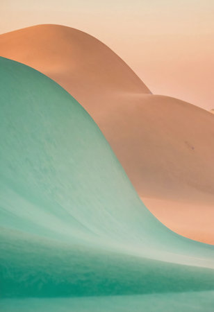 Soft curves of sand blend turquoise and golden hues as the sun sets over the serene desert, creating a peaceful atmosphere that invites contemplation.