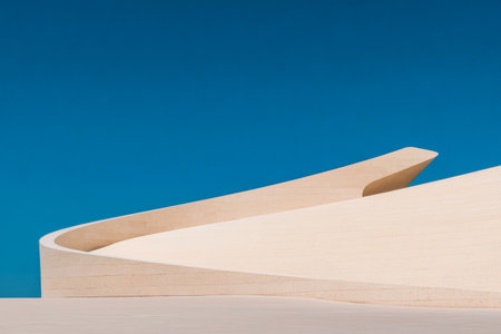 A sleek, modern structure showcases elegant curved lines, set against a vibrant blue sky, highlighting minimalist architecture and innovative design elements.