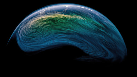 Isolated view of Earth with blue and green tones vivid against black, clouds swirling around continents and oceans