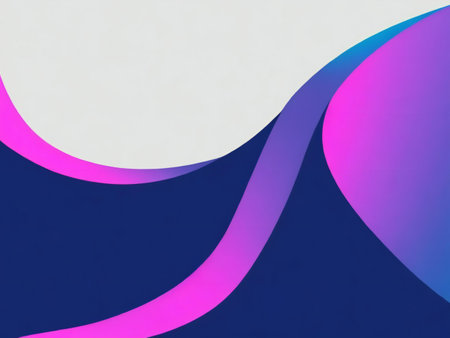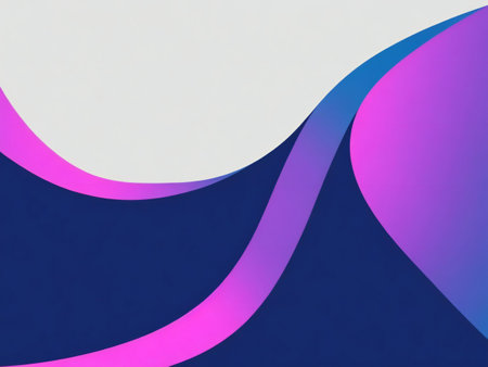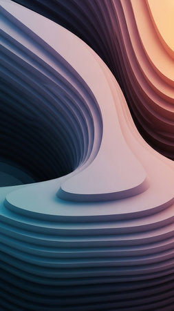 This image features an abstract design with layered, curved shapes. The composition uses a gradient of colors including blues, purples, and pinks, creating a sense of depth. This visually appealing artwork can be used for various purposes, such as backgrounds and design elements in digital and print media.