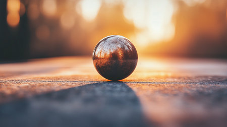 A worn vintage ball sits poised on a weathered court, its vibrant colors faded with time. The soft light of dusk casts a nostalgic glow, inviting memories of past games and playful moments shared on this once lively surface.