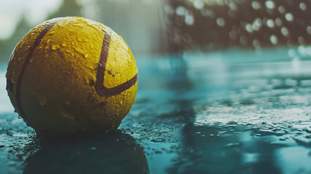 Yellow tennis ball is sitting on a wet surface. The ball is surrounded by water droplets, giving it a shiny and reflective appearance. Concept of calmness and tranquility