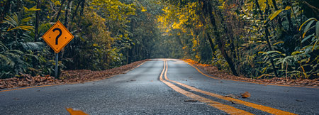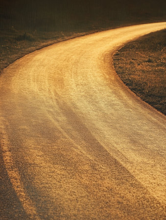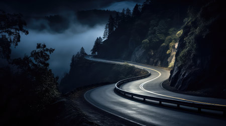 Winding road through dark forest at dawn, mysterious travel journey concept