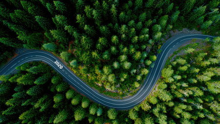 An overhead shot presents a serpentine road cutting through a dense forest of evergreen trees. The image showcases a natural outdoor setting under daylight. The colors are predominantly green and blue. This image is suitable for various commercial uses, including website design and editorial content.