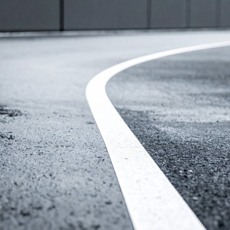 A clean white line curves gracefully across a dark, textured asphalt surface.