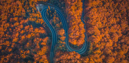 An aerial view of a winding road through a forest with vibrant autumn foliage. The trees are ablaze with red, orange, and yellow colors.
