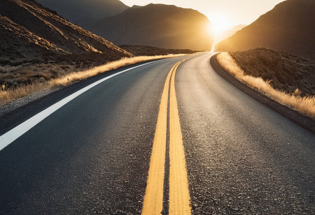 Road in the mountains at sunset, California, USA. Travel and adventure concept.