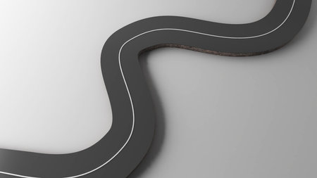 High angle top-down view of an empty, winding road with a dotted center line disappearing into the d