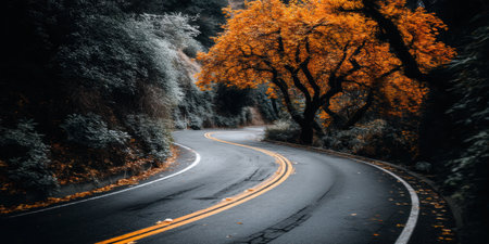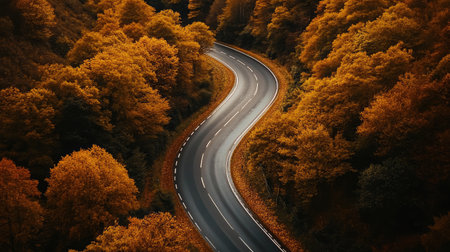 A picturesque curved road meanders through a tranquil forest, highlighted by trees adorned with vibrant orange leaves, creating a beautiful autumn scene.