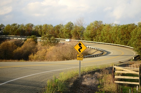 Road with dangerous curves. Traffic sign with the words Dangerous curves (English: Dangerous curves), the speed limit is 30 km / hr for it.