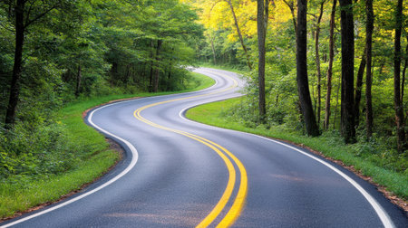 A beautiful curved road meanders through a vibrant forest, with sunlight filtering through lush trees, creating a serene atmosphere ideal for outdoor adventure.
