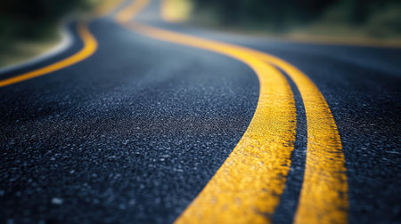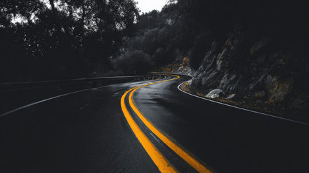 A dark, asphalt road curves through a dense forest. The two yellow lines guide the viewer's eye along the road's path. The composition features deep shadows and muted colors, and the scene evokes a sense of journey. Suitable for illustrating travel themes, transportation or environmental concepts.
