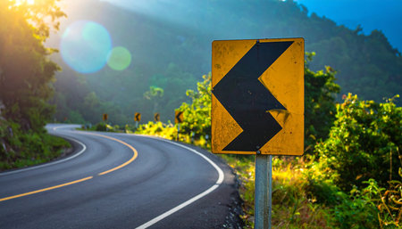 A yellow chevron sign warns of a sharp left curve on a winding mountain road, with a sun flare and lens flare adding atmosphere at sunrise.