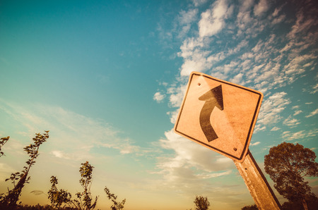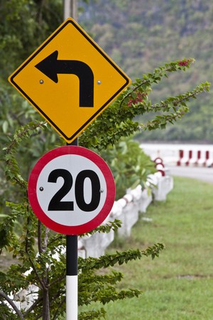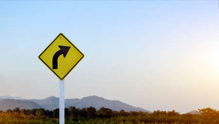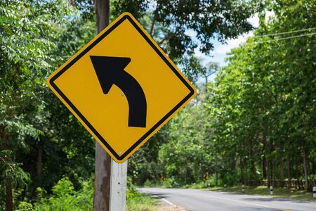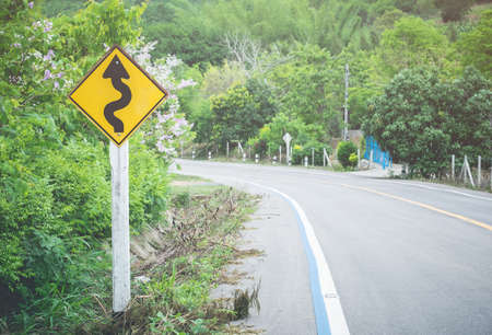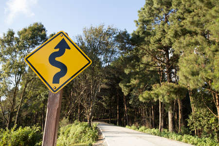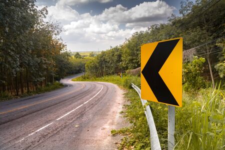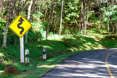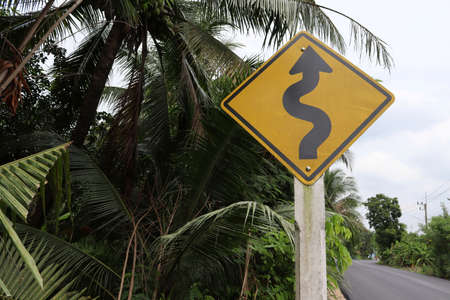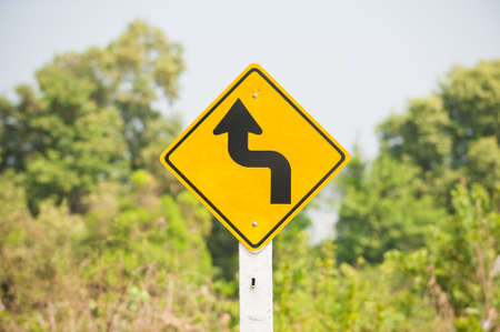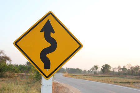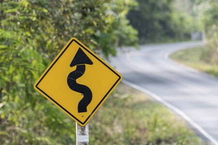 Curve winding road sign yellow for more carefully to drive the car and vehicle.