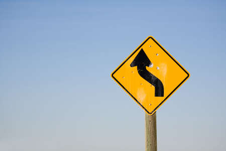 winding road sign with bullet holes - turbulent times ahead, dangerous future.