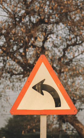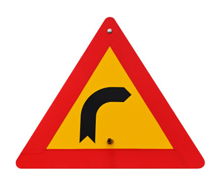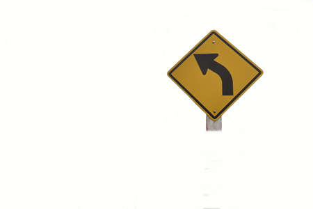 Traffic yellow road sign curved left ahead isolated on white background closeup.