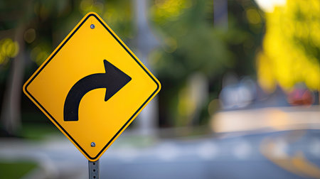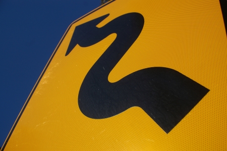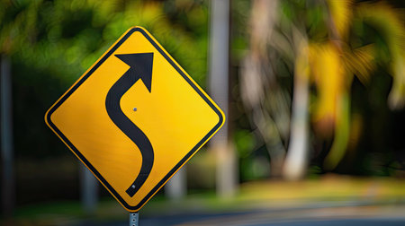 Yellow diamond traffic sign with a left curved arrow, indicating a turn