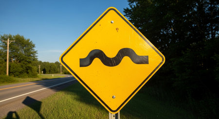 This image features a weathered yellow warning sign with a black wavy line, symbolizing curves, providing a clear alert for drivers about upcoming road changes.