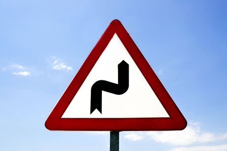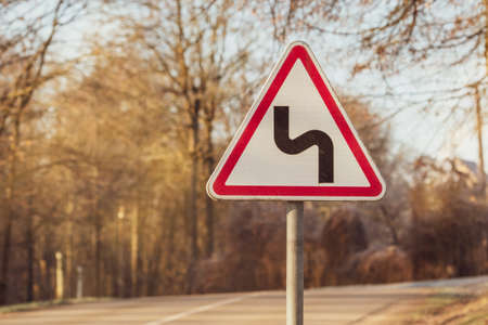 Road sign indicating curves ahead. Selective focus, background and foreground blur.