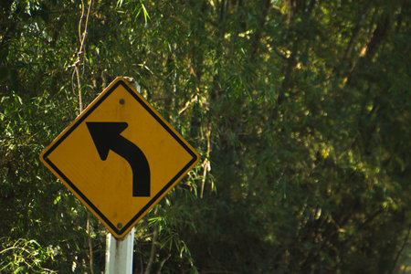 Yellow left curve warning road sign on rural roadside surrounded by green trees in natural daylight.