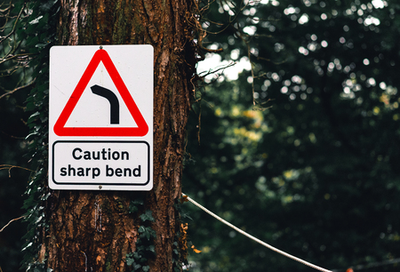 A Caution Sharp Bend sign hung up on a tree in the UK in a forest
