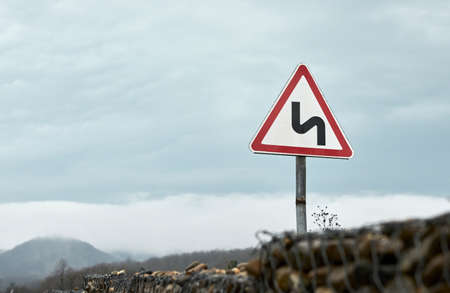 Road sign dangerous turn on a mountain pass in rainy foggy weather. Selective focus.