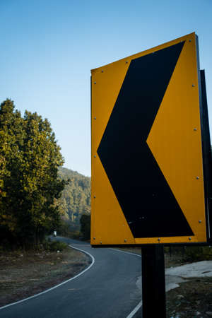 Winding road with yellow sign for a sharp curve through a forest. Traffic sign on mountain route.