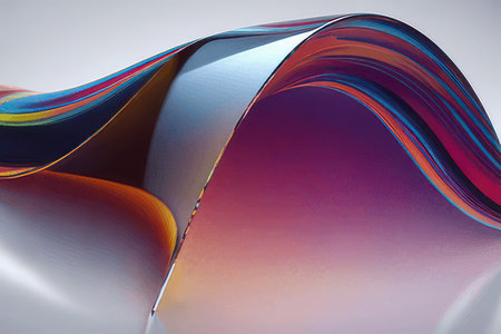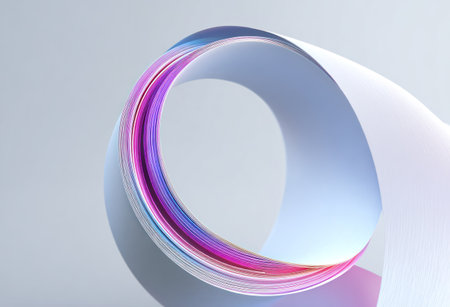 A flowing, looped ribbon of white material with colorful edges, spiraling against a light gray backdrop