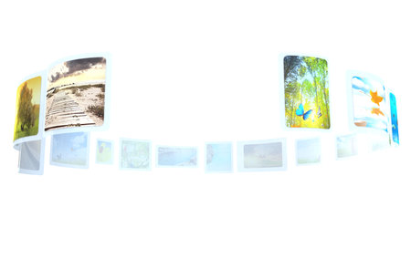 A person's hands hold a fan of printed photographs displaying various landscapes and portraits over an open photo album. The image evokes nostalgia and the process of preserving memories in a physical format. The clean composition suggests a hobby of scrapbooking or organizing family photos.