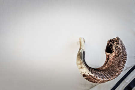 Shofar on a tallit - ancient musical trumpet made of ram's horn on Jewish prayer shawl