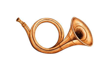 Watercolor illustration of a bugle wind musical instrument isolated from background. Musical instrument on the theme of music, hobby, learning. For the design of a postcard, poster, book cover, album, interior element.