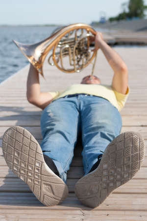Portrait of teen musician playing instrument classic french horn. Close-up
