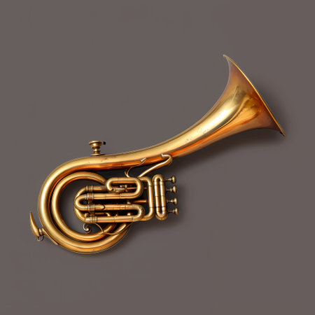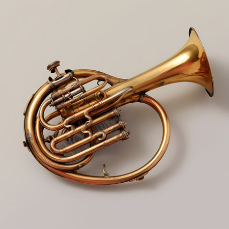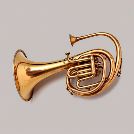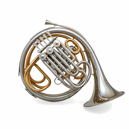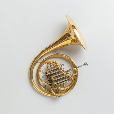 Stunning detailed image of a polished brass French horn set against a solid white background, perfect for music-themed projects and artistic visual expressions.
