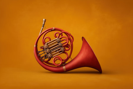 A vibrant red french horn positioned against a warm orange backdrop. This image captures the elegance and artistry of musical instruments, perfect for music-related themes. ai generated.