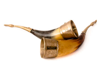 Old and curved drinking horns isolated on white