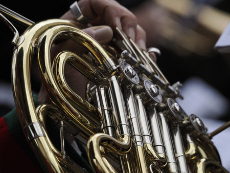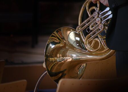 French horn instrument, hands playing horn player in philharmonic orchestra