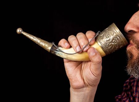 man with a beard holds the horn for wine with his right hand and drinks from it. Profile view