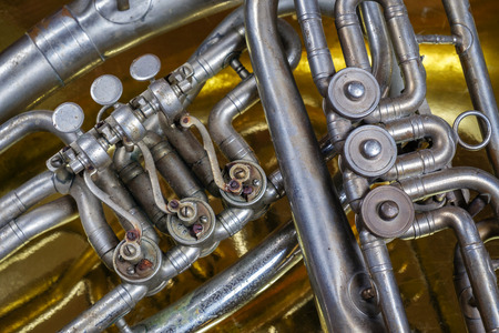 Close-up of brass french horn valves and tubing.