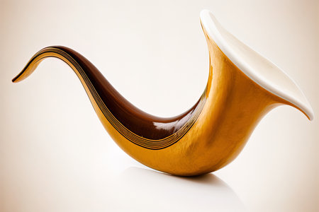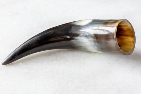 A polished shofar horn lays on a marble surface, ready for use in a religious ceremony. The horn is a traditional symbol of Jewish faith, and the marble represents the beauty and purity of the ritual.