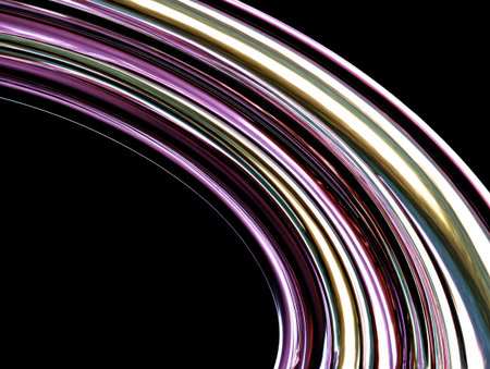 This image presents abstract curved lines against a black background. The lines exhibit a gradient of colors including purple, white and gold. The composition evokes a sense of movement and energy, and it may be suitable for graphic design projects or visual representations. It offers a clean aesthetic for various applications.