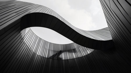 A dramatic black and white architectural shot featuring a modern building with a curved metal facade and a circular opening, creating a dynamic and abstract composition.