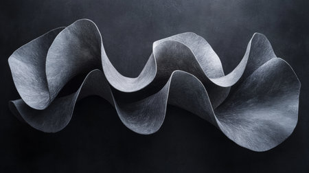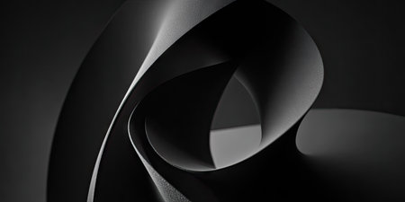 An abstract studio shot showcases intricately curved black paper against a dark background. The composition highlights the paper's form with strong shadows and highlights, creating a visually dynamic interplay of light and form. Suitable for commercial projects requiring graphic elements or backgrounds.