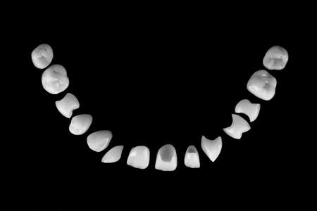 Dental prostheses on a white background. Beautiful teeth ceramic press ceramic crowns and veneers. Dental restoration treatment clinic patient. Oral surgery dentist