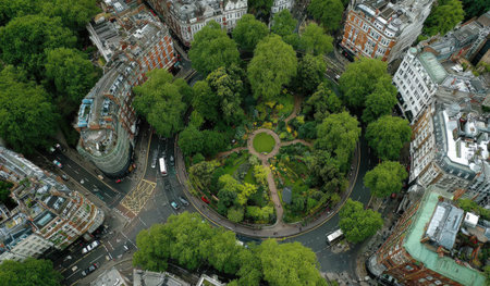Aerial perspective reveals a circular park filled with green trees and pathways, surrounded by urban architecture, creating a peaceful retreat in the bustling city