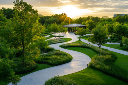 Scenic view of a winding path leading to a pavilion in a beautiful green park, illuminated by the warm glow of the setting sun