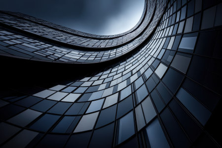 A building with a lot of windows and a very dark blue color. The building is very tall and has a very interesting shape