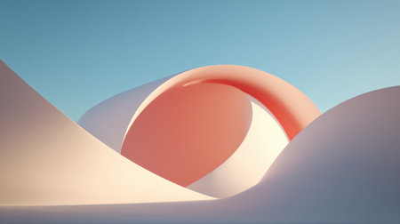 A captivating abstract scene featuring soft geometric shapes in smooth tones. The composition blends curves and clean lines against a clear blue sky, evoking modern minimalism.
