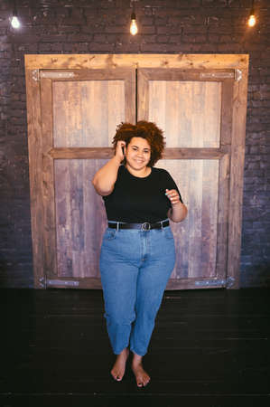 Beautiful curvy oversize African black woman afro hair barefoot in black t-shirt and jeans in loft interior with wooden door. Body imperfection, body acceptance, body positive and diversity concept.