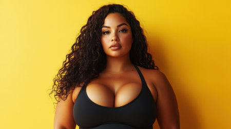 Curly-haired woman in a black sleeveless top gazes confidently forward with a slight smile, standing against a vibrant yellow backdrop. Her expression is calm and composed