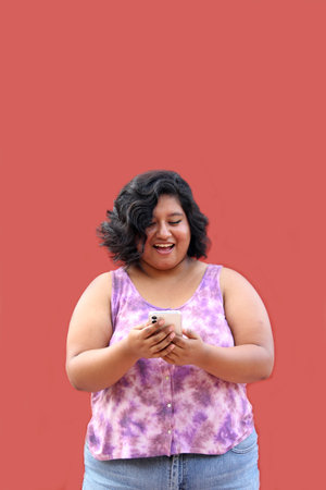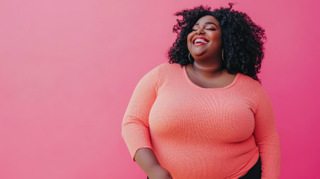 Excited plus size woman laughing and having fun. Beautiful oversized happy girl wearing casual clothes smiling. Body positive and diversity concept